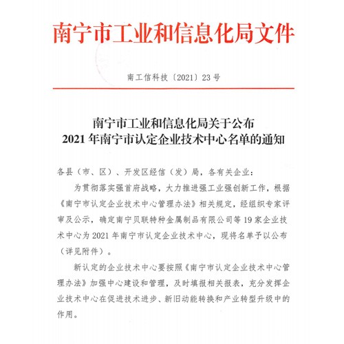 關于公布2021年南寧市認定企業技術中心名單的通知